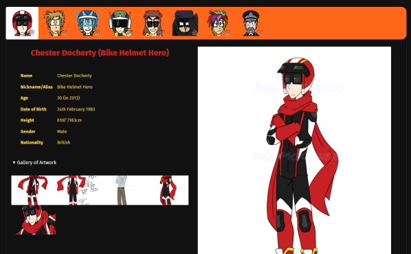 It’s currently home to Bike Helmet Hero’s characters, but also the characters from Bike Helmet Hero: Legends and Bike Helmet Hero: Origins… once I get around to actually drawing these comics, I’ll likely split them out into their own hubs. =) For those confused/intrigued;
